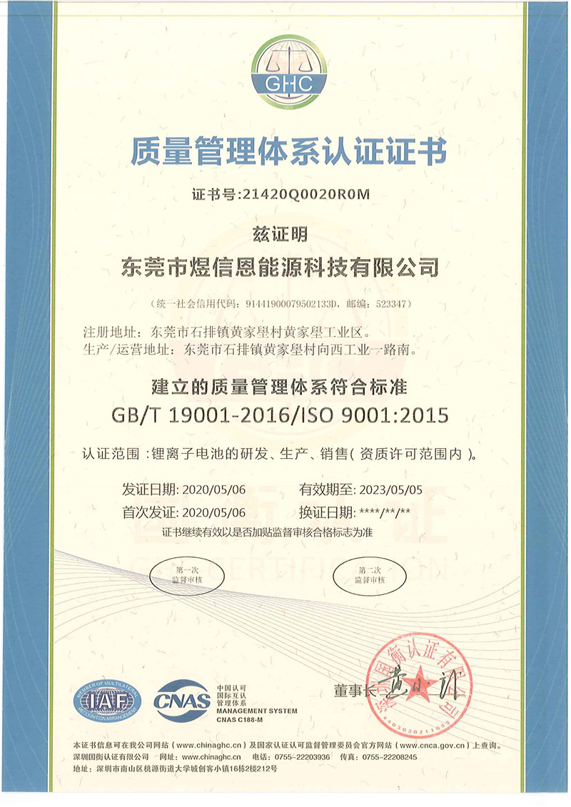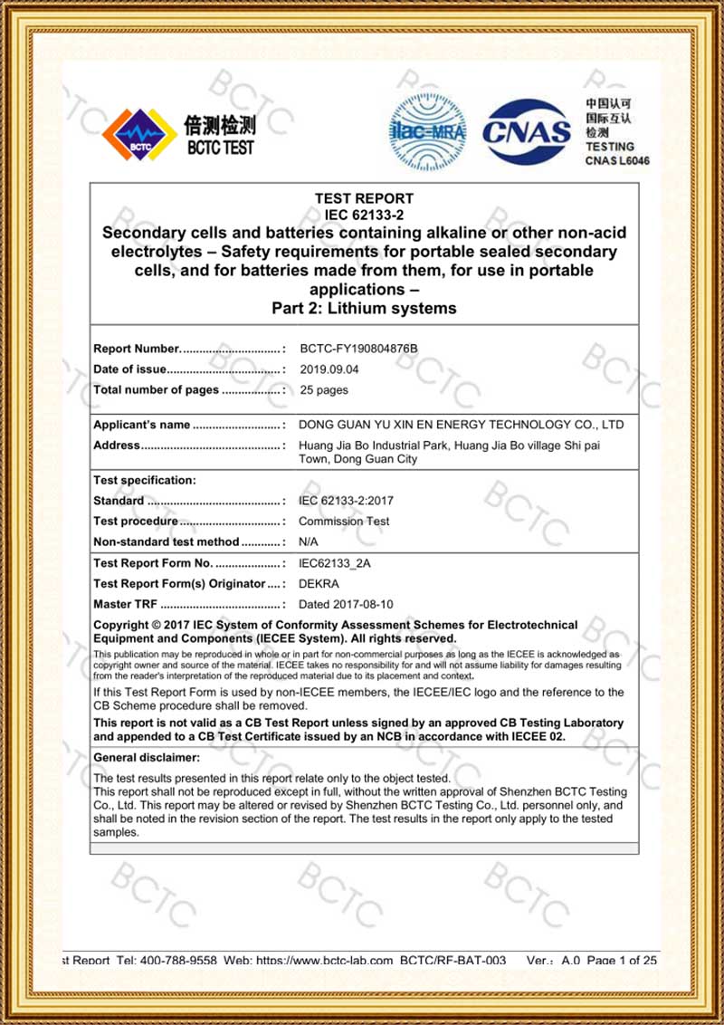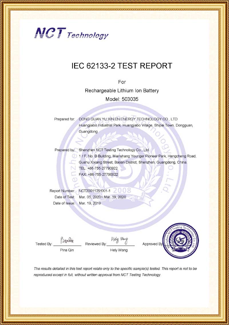 煜信恩 YXE 503035 IEC62133-2:2017报告